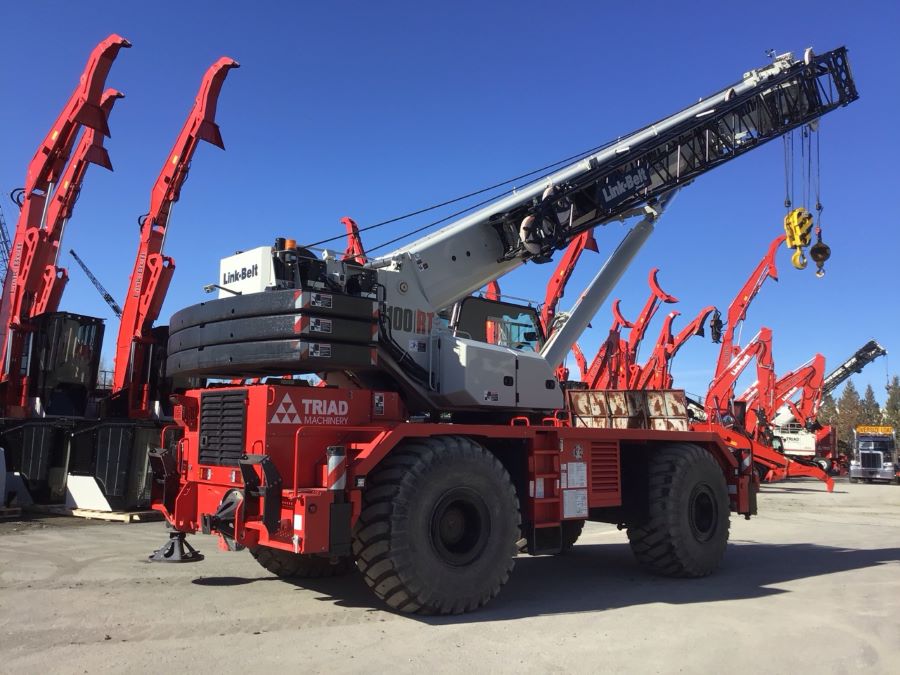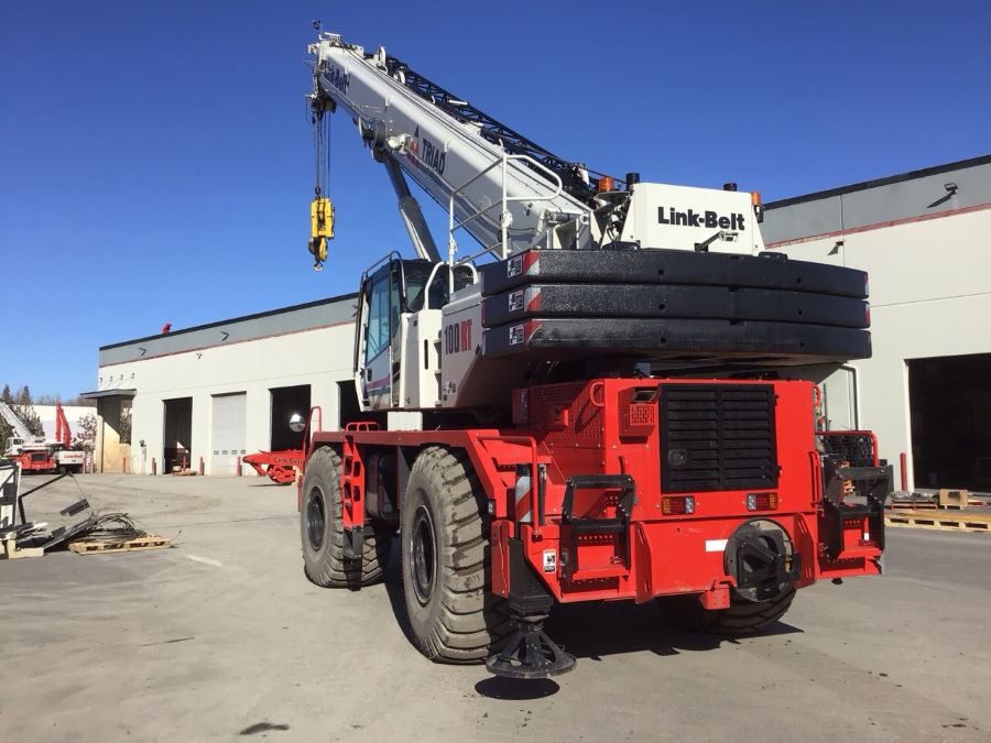 Triad Machinery Rental Fleet 2022 Link-Belt 100RT crane equipped with two piece bifold fly, 60 ton three sheave hook block and 12 ton hookball.