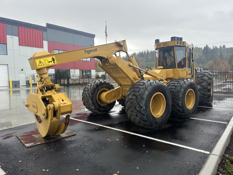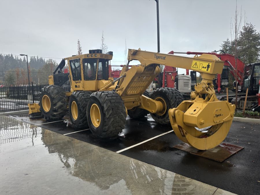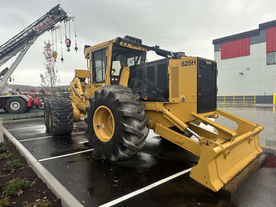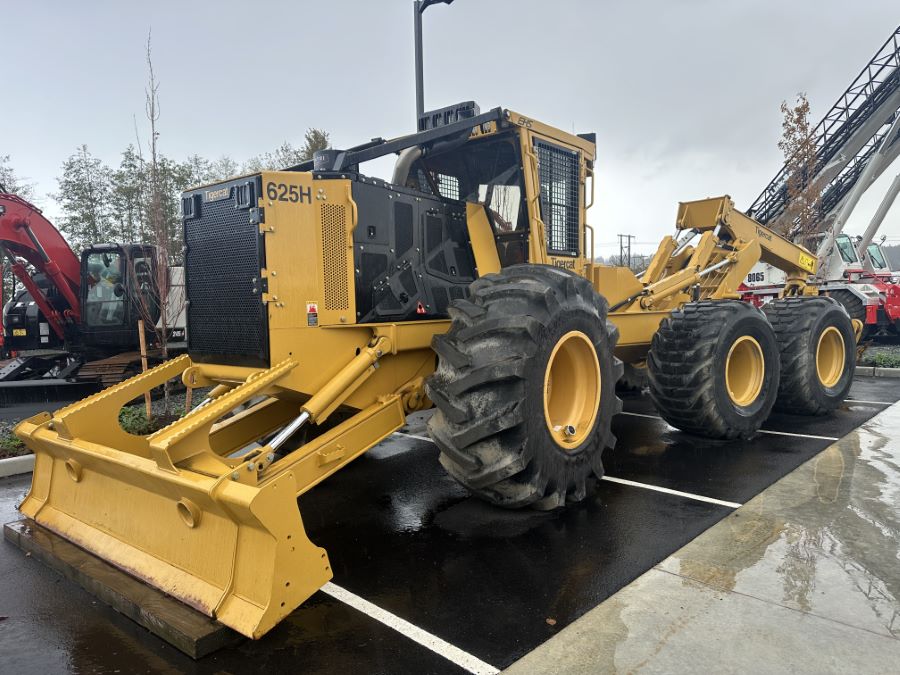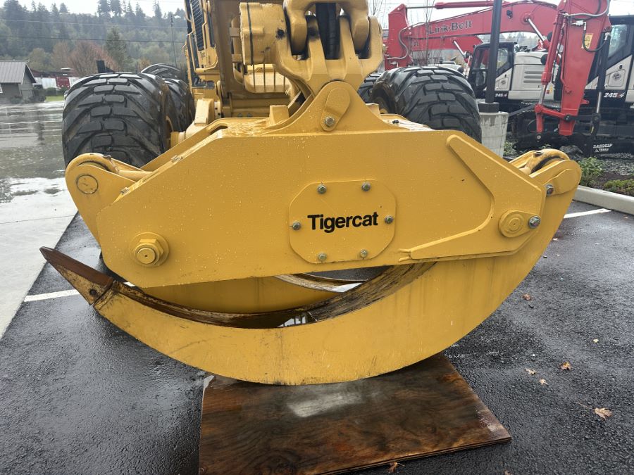Tigercat 2023 625H 6-Wheel Skidder equipped with 21 SQFT Grapple with Box Tongs and Replaceable Tips, Dozer Blade with Tether Assist Setup, EHS Transmission, Heavy Belly Doors & Guards, High Output LED Lights, Rotating Seat, Large Fuel Tank and Remote Log Telematics.